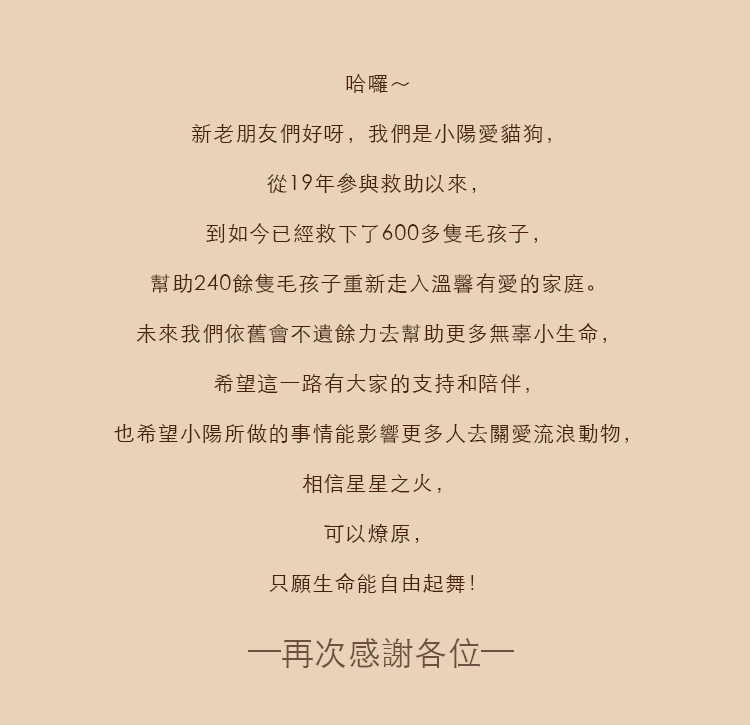 🐾 全館商品皆由小陽團隊用心設計與製作。 🐾 部分收益將用於救助流浪動物。 🐾 下單後,約5-7天即可收到您的愛心商品。