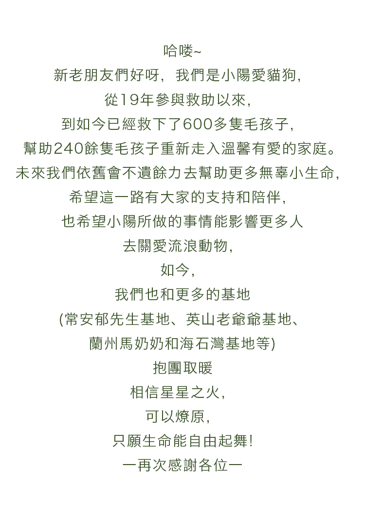 🐾 全館商品皆由小陽團隊用心設計與製作。 🐾 部分收益將用於救助流浪動物。 🐾 下單後,約5-7天即可收到您的愛心商品。