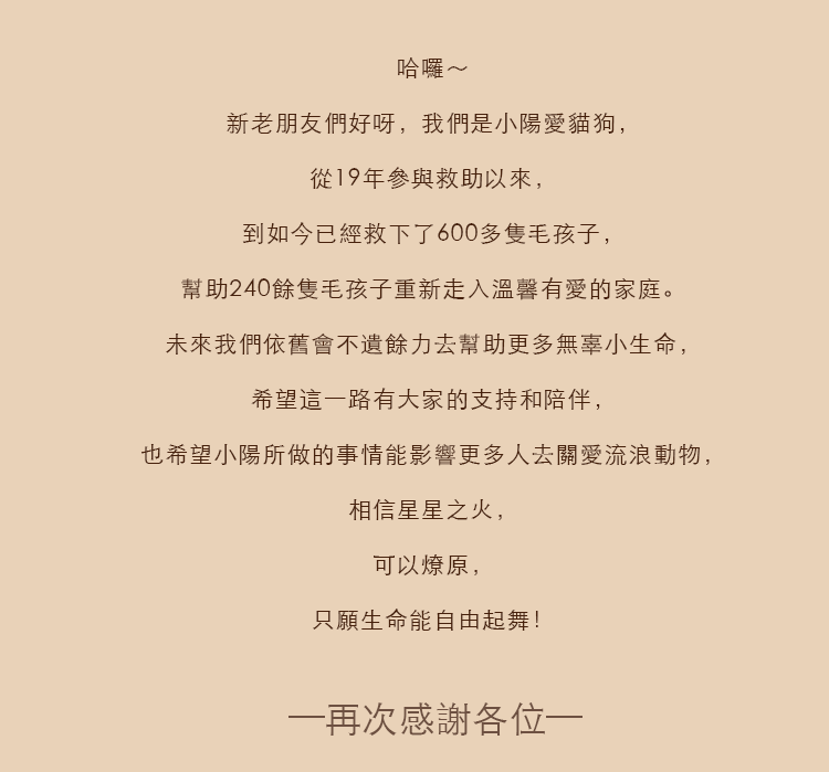 🐾 全館商品皆由小陽團隊用心設計與製作。 🐾 部分收益將用於救助流浪動物。 🐾 下單後,約5-7天即可收到您的愛心商品。